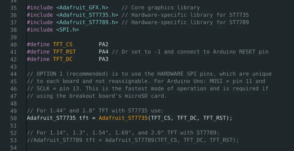 Adafruit wrote an excellent example code (graphicstest) to get us started. It includes a very detailed guide on different ways to initialise the screen and SPI. We can initialise the ST7735 with or without the reset and chip select signals, or use custom SPI pins. I highly recommend reading through all the comments in this example to learn about the library.