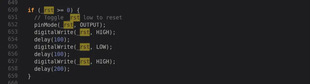Then, we looked into the source code of the Adafruit ST7735 to figure out what went wrong. The CS and RST pins on the ST7735 is optional in this library and the way to disable it is to set them to -1. However, the Adafruit library actually treats all "negative pin numbers" as disabled, as shown below. But, why will the pin number be negative?