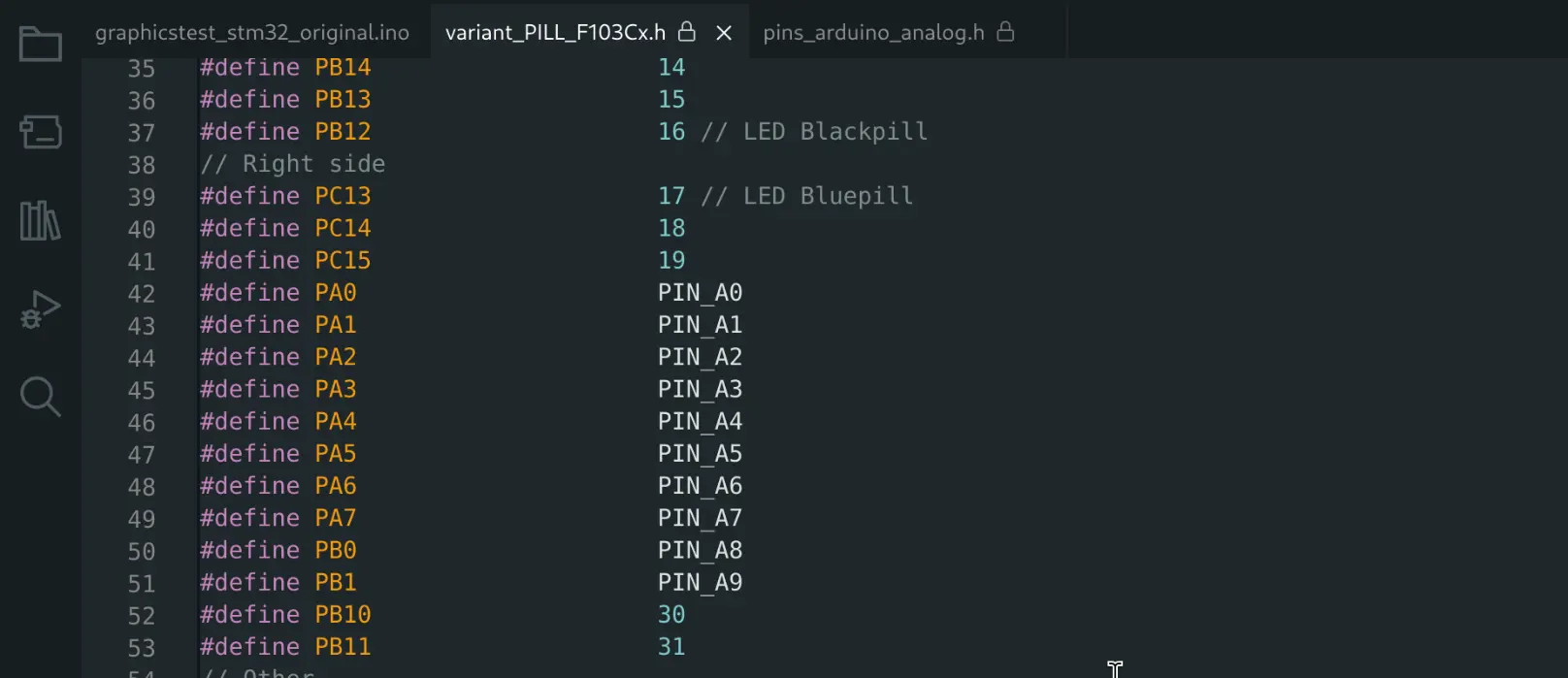 If we look at the pin macro definitions in the STM32 Arduino core, we can find some interesting definitions. The pins that are connected to the ADC has an extra layer of macros, which ultimately lead to value between 0xC0 and 0xC9.