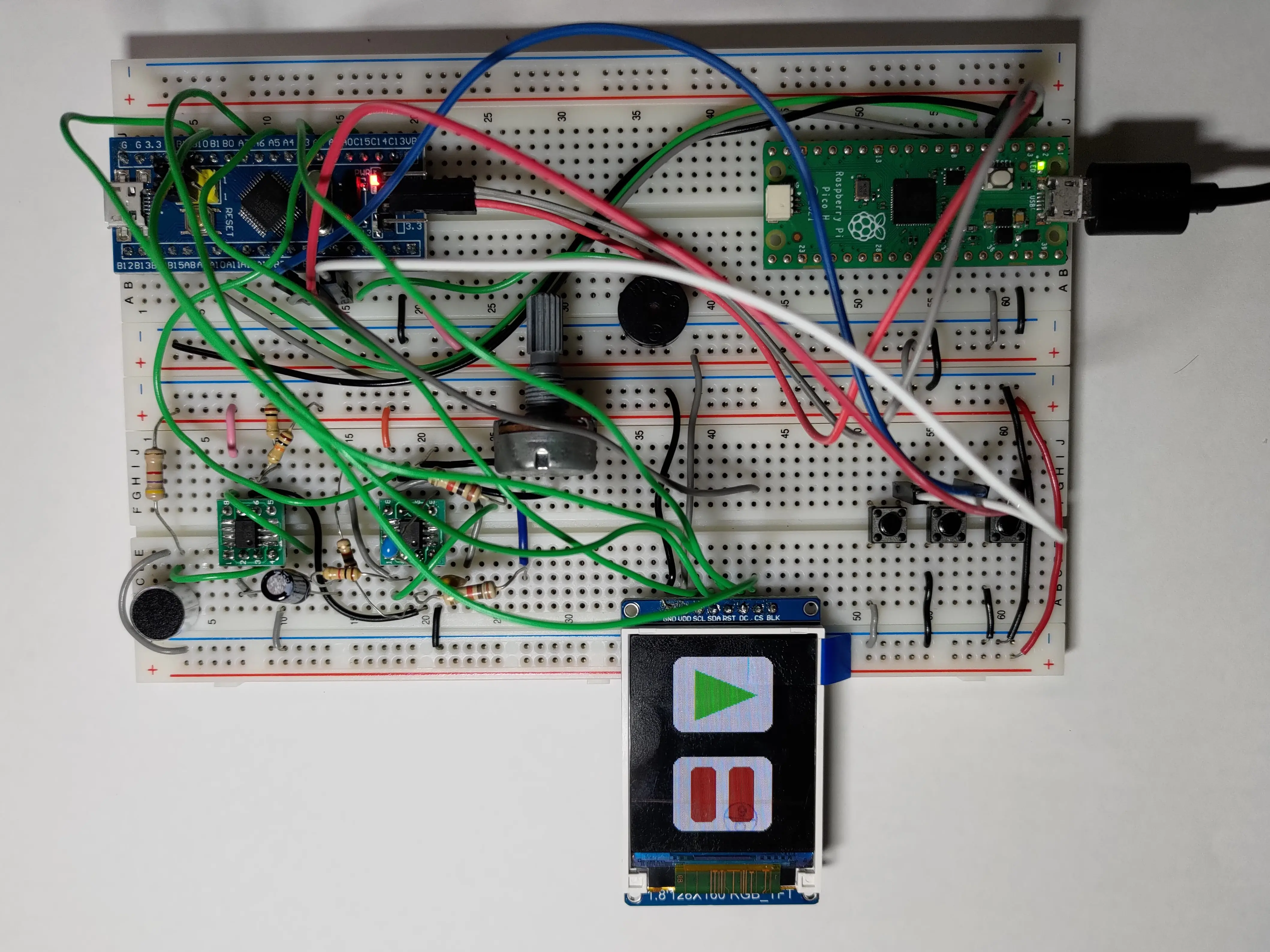 Since most members of our team never used an STM32 before, we decided to use the STM32 Arduino core and programme it with Arduino IDE. We were only making a game, so the trade off between performance and developing time was worth it. To upload the compiled binaries to the STM32, we used a Raspberry Pi Pico as an SWD adapter.