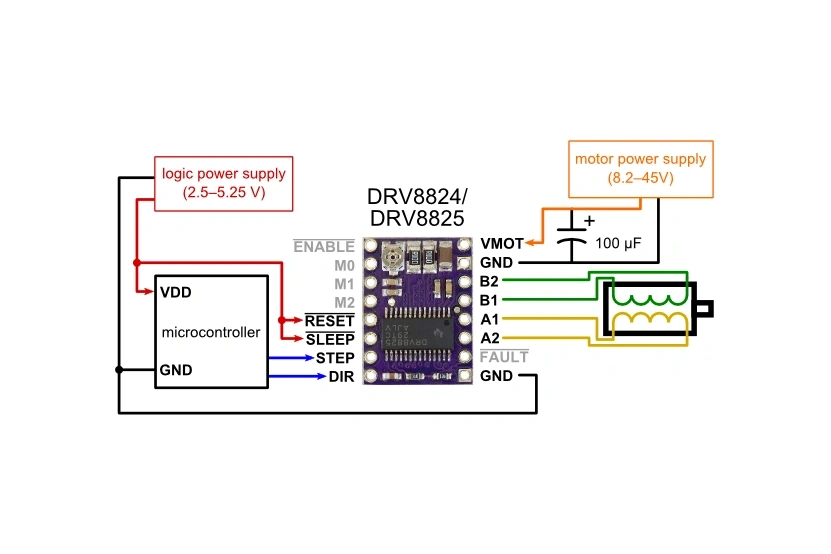 The STM32 microcontroller cannot provide the necessary current and voltage for the stepper motor. Thus, We need an external driver IC to drive the stepper motor. I used a very common driver module based on Texas Instruments' DRV8825 IC.