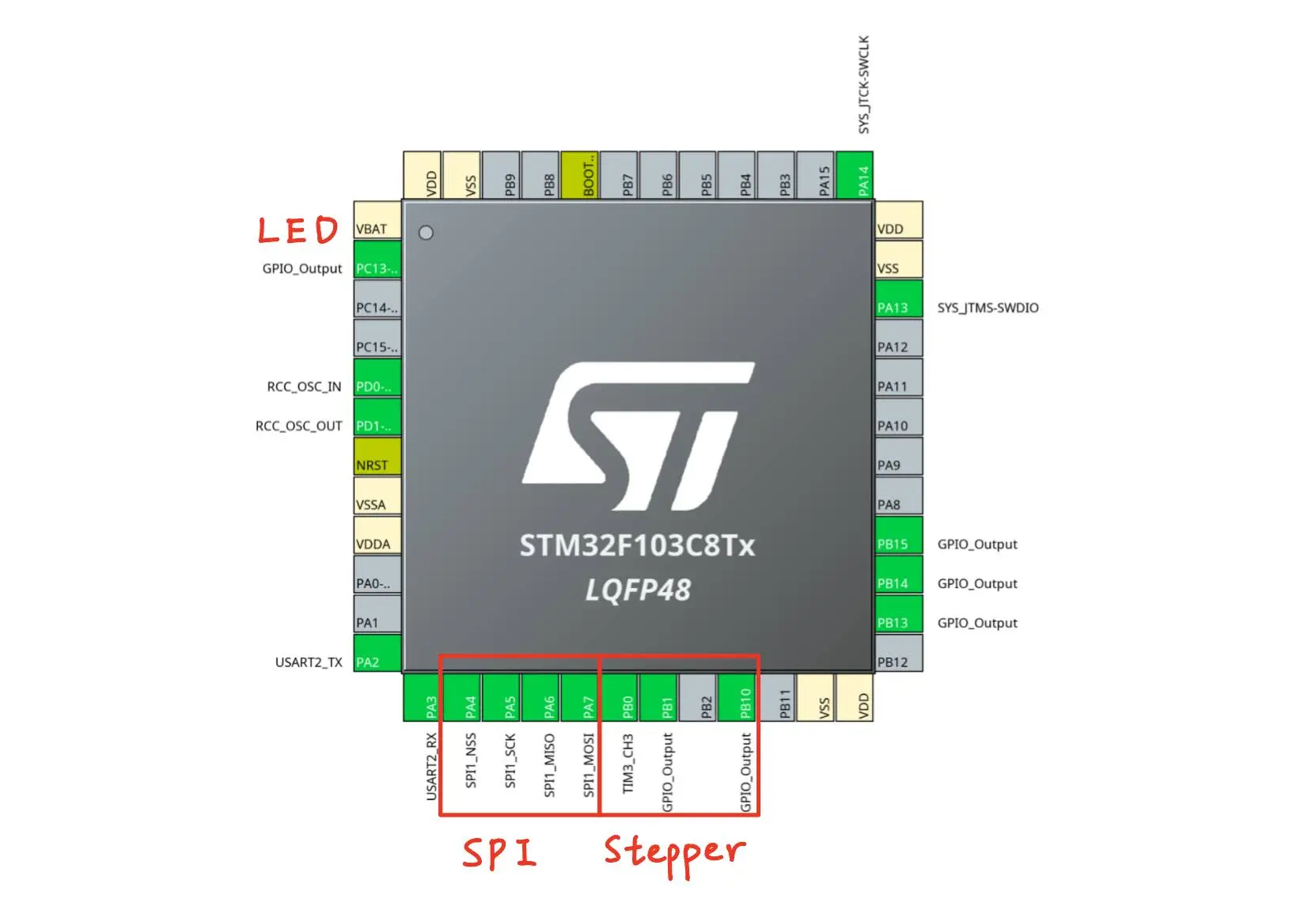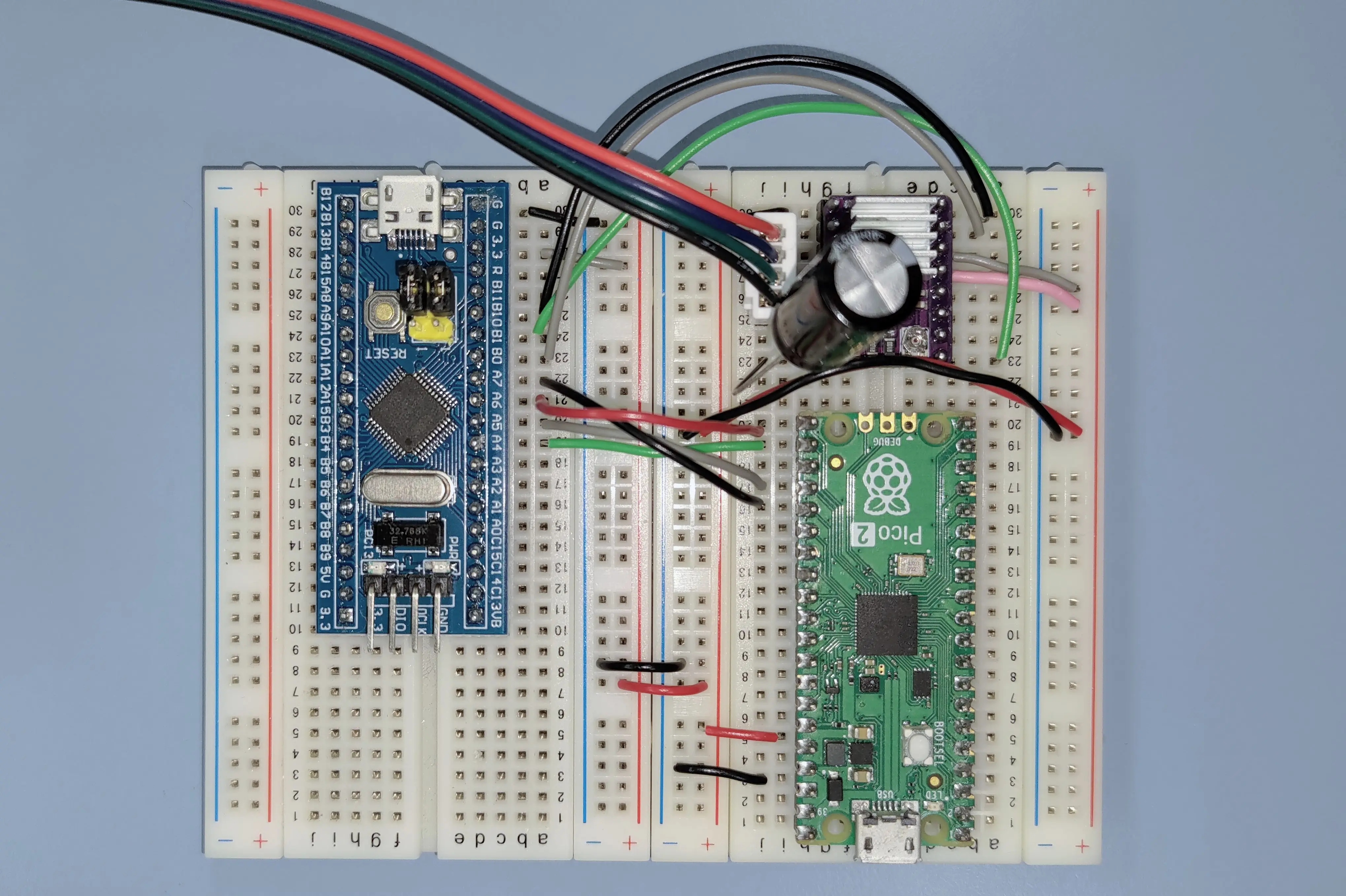 This project is a part of a robot whose central controller is a Raspberry Pi 5. The STM32F103C8T6 is an SPI slave and it will receive commands from the Pi 5 to spin the motor at the specified speed, but I will be testing it with a Pi Pico 2 as the master instead in this blog. I will go into the details of SPI slave mode operation in a future blog. Everytime an SPI frame is received on the STM32, it will trigger and interrupt and set the new compare and auto-reload values.
