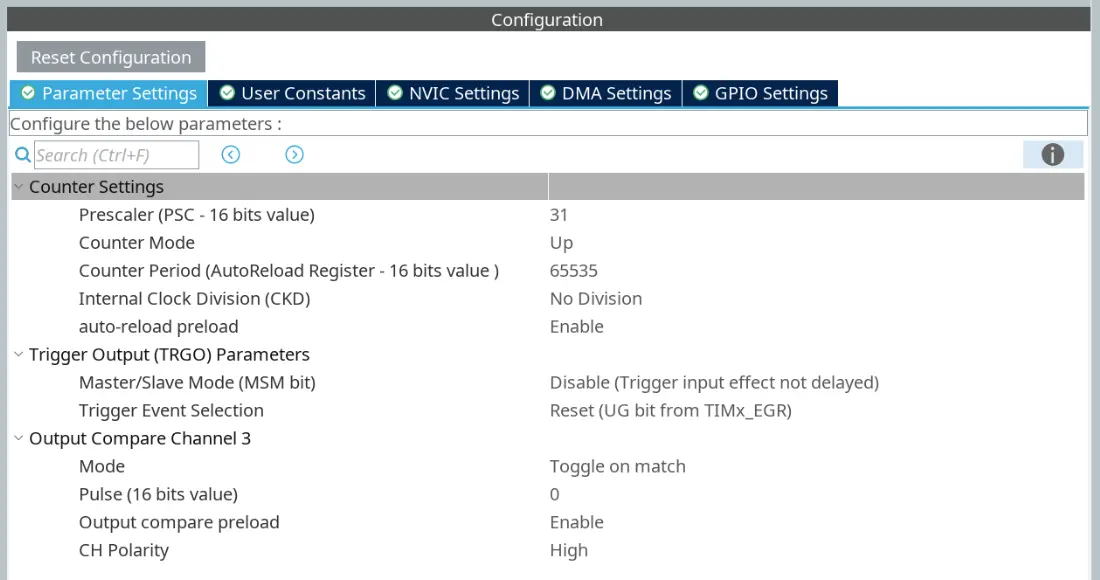 I figure that setting the pulse period resolution to 8us will give us a good balance between stepper motor speed range and precision. To achieve this, we need to slow down the clock for the TIM3 to 0.25MHz (4us per clock cycle) by setting the prescaler to 31. The prescaler will divided the 8MHz clock by a factor of 31 + 1 and give us the desired 0.25MHz clock. Since the pulse is generated every two counter cycles, the resolution will be 4us * 2 = 8us.