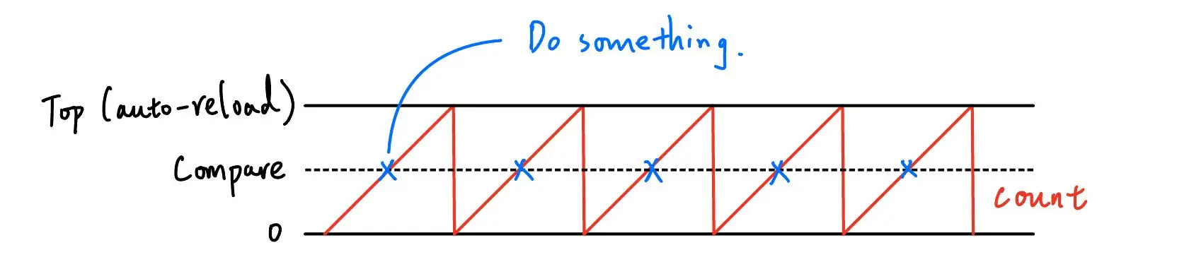 A timer is basically a counter that increments (or decrements) every clock cycle. We can set a value to compare with the counter, when they are the same, the microcontroller can trigger some specific actions. We can also set the top (auto reload) value of the counter, at which it will reset and count from the start again.
