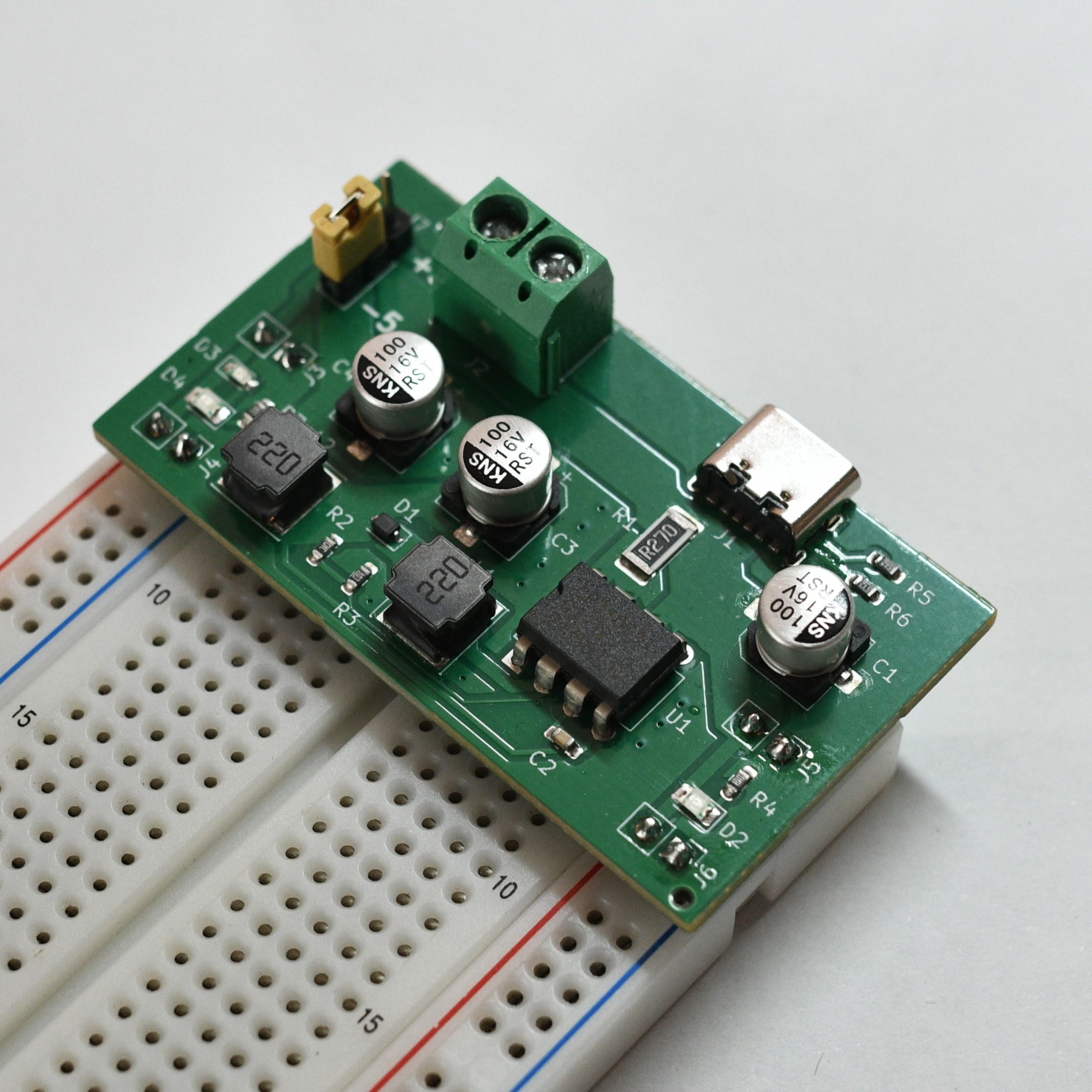 In the past, I always avoided projects that require split rail power because of the extra effort needed to get that negative rail. To solve this problem, I designed a simple +5V to -5V switching converter PCB to provide a negative rail from USB. Once connected to power via USB Type-C, the right power rail of the breadboard will be +5V and the left power rail will be -5V.