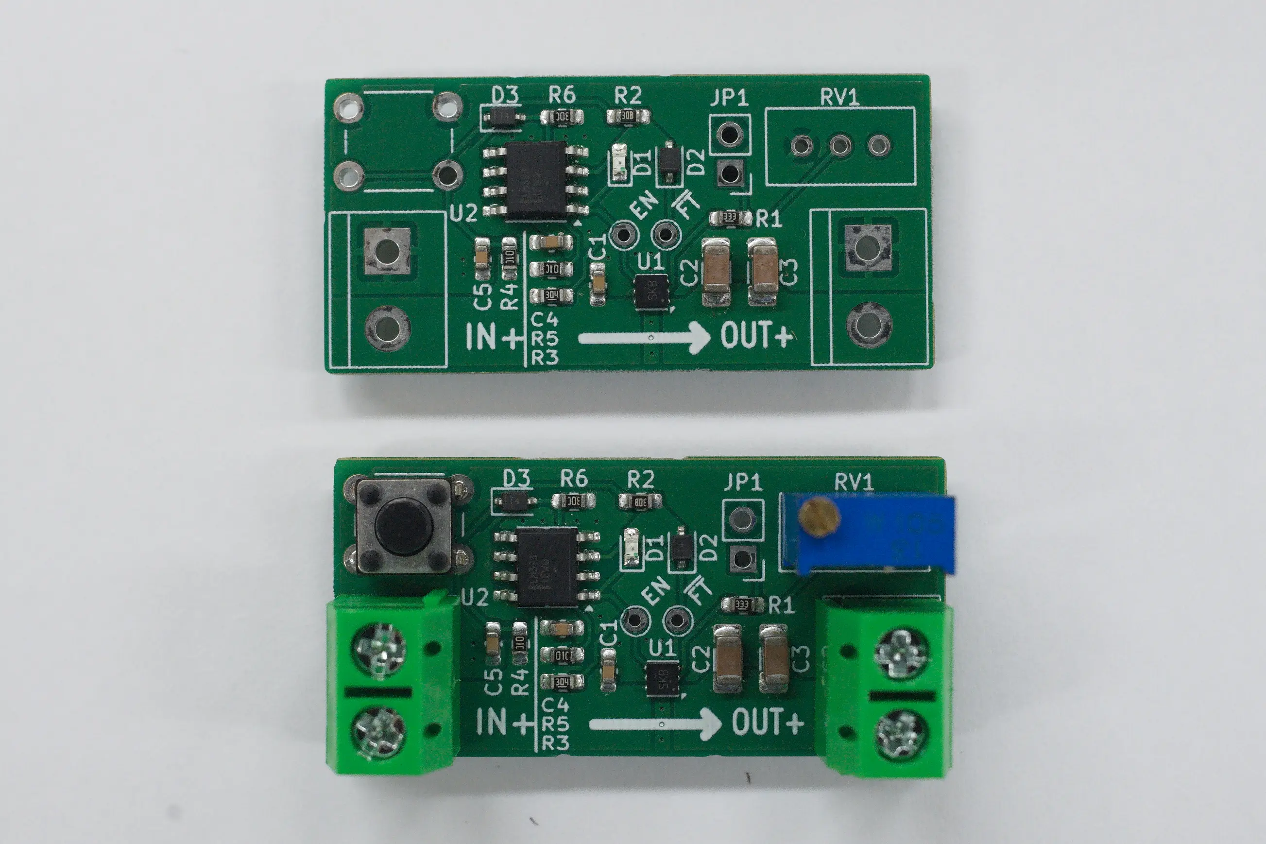 The current-limit threshold is programmed via a potentiometer, ranging from 100mA to 2.9A. The eFuse will shutdown after an over-current event and a red LED will light up to indicate a fault. By pushing the button on the module, the eFuse will reset and resume normal operation if the over current/short is removed.