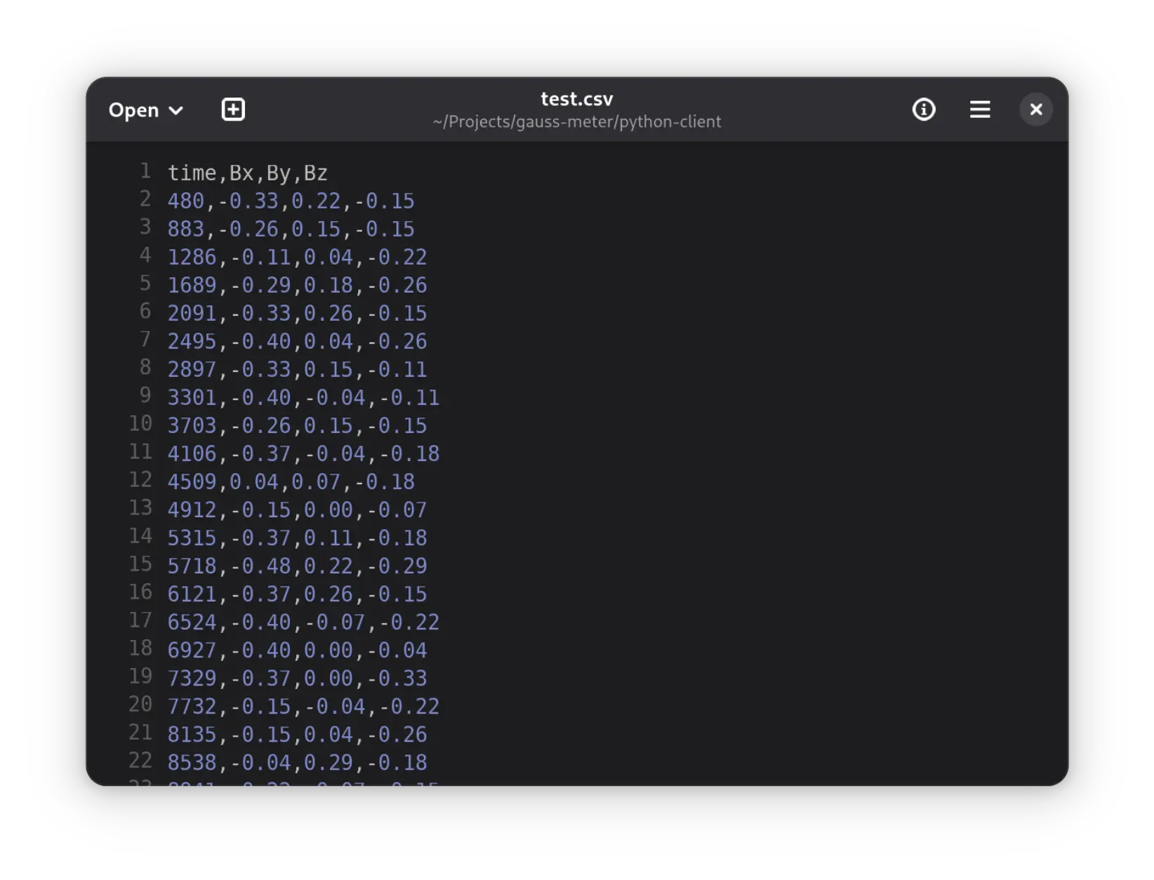 In logging mode, the program will produce a CSV file. There are four columns in the CSV file: time and magnetic field on the three axes. The units are microseconds (us) and millitesla (mT) for time and magnetic field, respectively.
