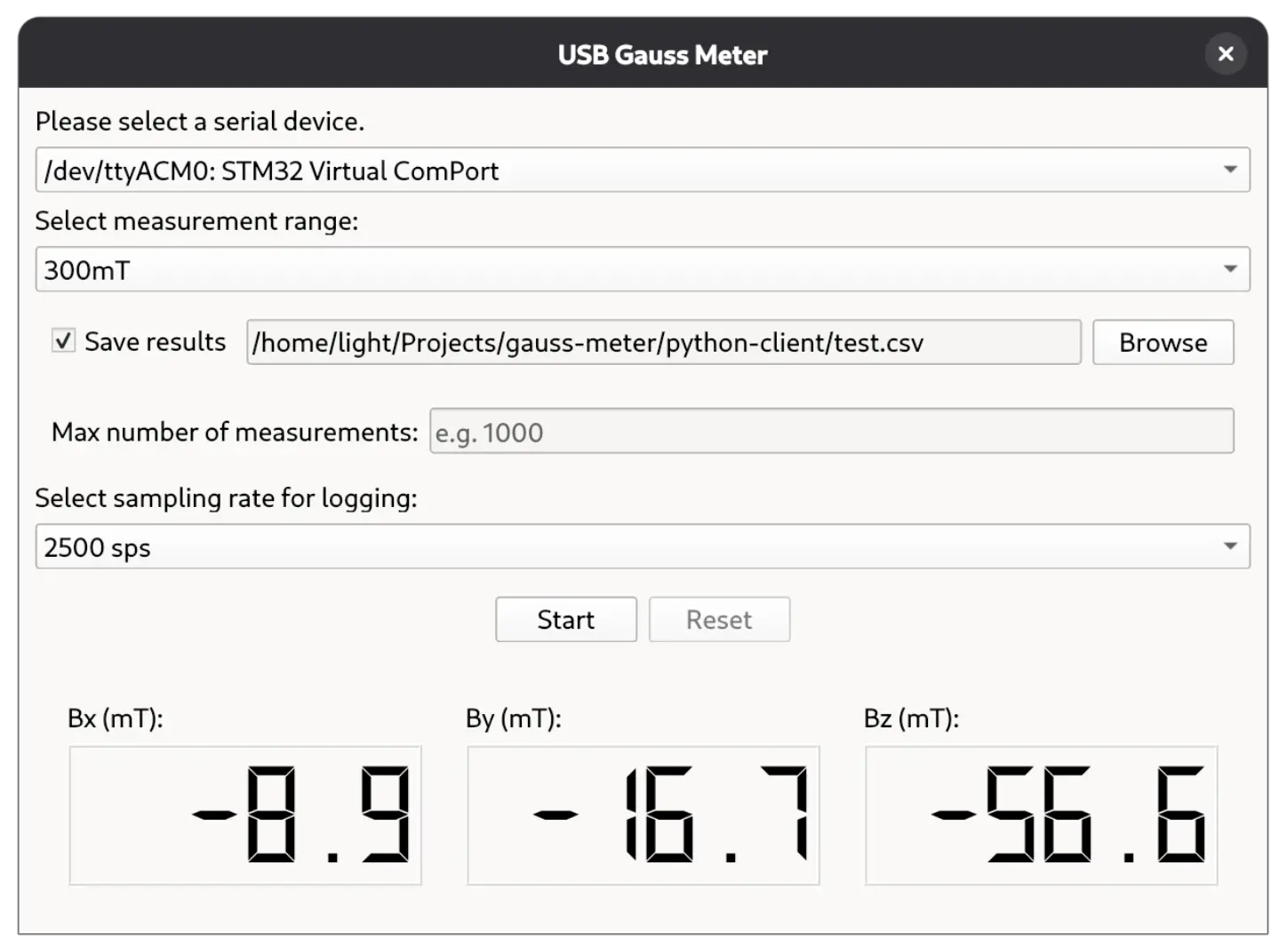First, select the serial device. The USB 3D Gauss Meter should show up as STM32 Virtual ComPort. Next, you can select the measurement range. There are three options: 75mT, 150mT and 300mT.